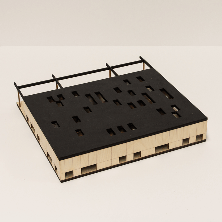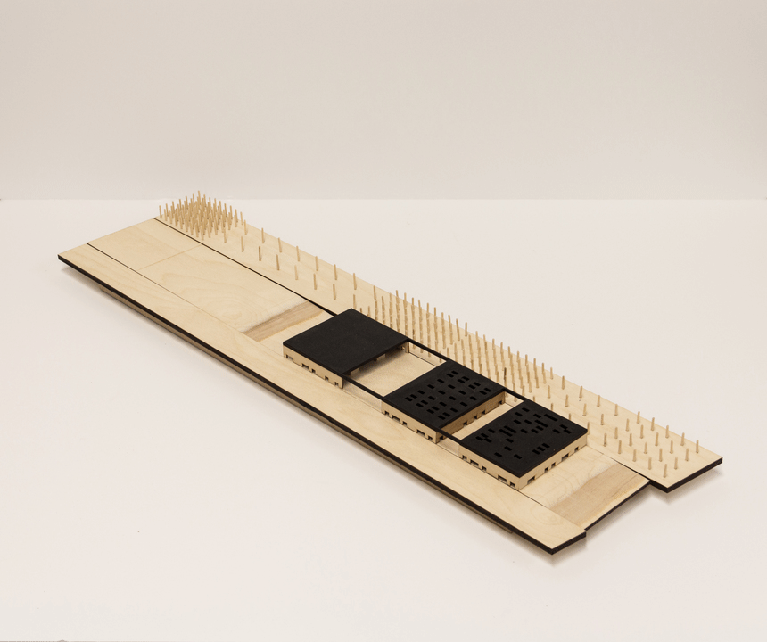 Centre 51 is Toronto’s Great Lakes Educational Facility, located on a former industrial site and using an existing warehouse structure. The existing warehouse was split into three parts for different types of program. The programmatic functions are in the westernmost part and are arranged in wood “boxes”. These programs are also wrapped in a polycarbonate skin, and the entire building is surrounded by the existing concrete walls. These separate skins that contain the program create different spatial conditions throughout the building and also help create microclimate within the fully occupied spaces as well, reducing the energy usage of the building. The site around the building features gridded trees that reference the rigid structural grid of the building. On the opposite side of the building, the large open space is preserved to allow for large scale outdoor events. This building seeks to be an example for the reuse of older buildings as a strong aspect of sustainable design.